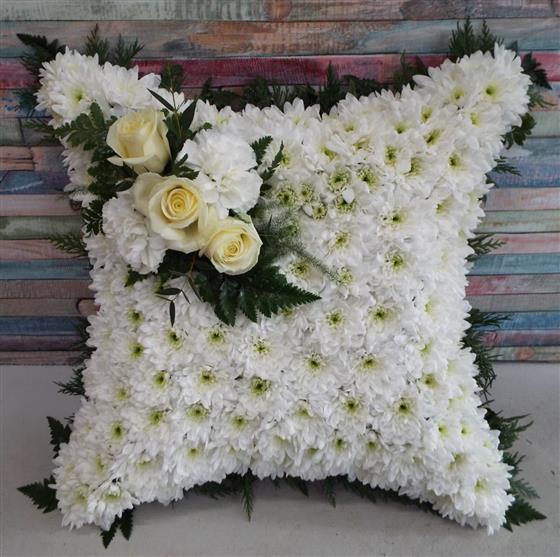 A traditional chrysanthemum based cushion with your choice of size, colour of cluster spray on top and edging. If you choose ribbon edging please note we will correspond this with your choice of cluster spray.