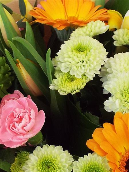 A sweet bright and happy hand-tied in water in seasonal flowers.