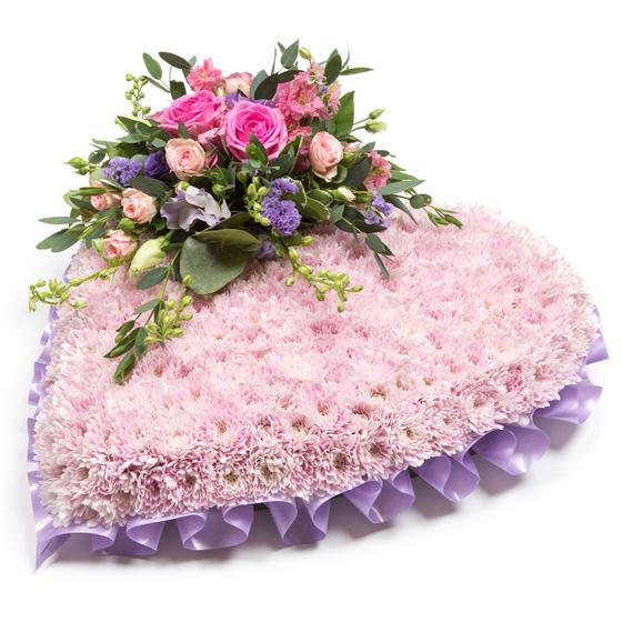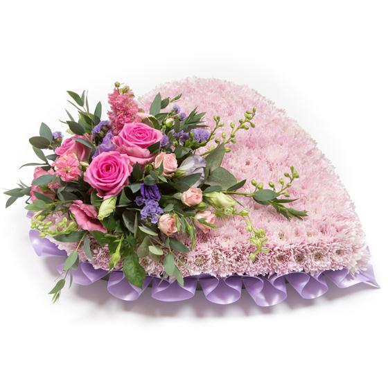 A traditional pink chrysanthemum based heart and lilac ribbon edge. This pretty heart is a perfect thoughtful tribute for a loved one.