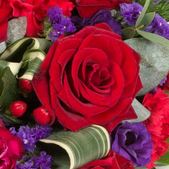 A posy pad arrangement of all red roses and seasonal purple flowers including hypericum berries and purple statice, with complimentary foliages dotted throughout.