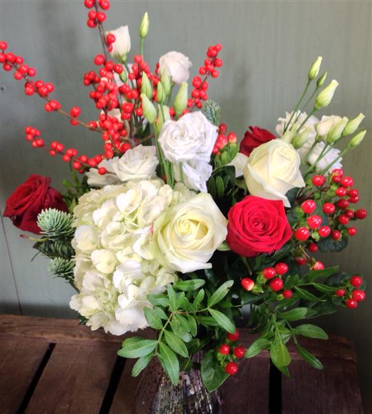 Ilex and hypericum berries, white and red roses, white lisianthus and winter foliage - a beautiful festive display.